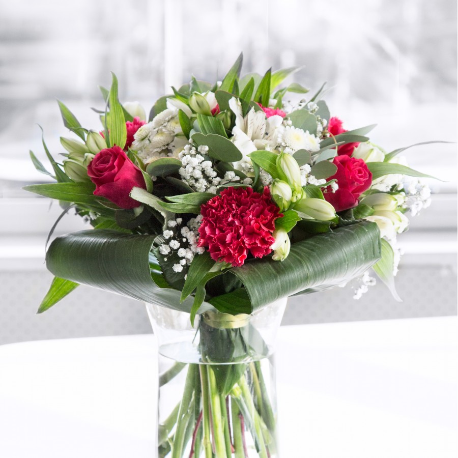 The combination of red roses and white chrysanthemums was stunning. The presentation was elegant.