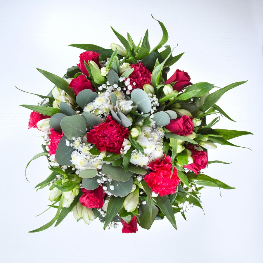 Elevate any occasion with our sophisticated bouquet, expertly arranged to inspire and charm. This stunning arrangement features luxurious red roses paired with elegant white chrysanthemums and delicate gypsophila.